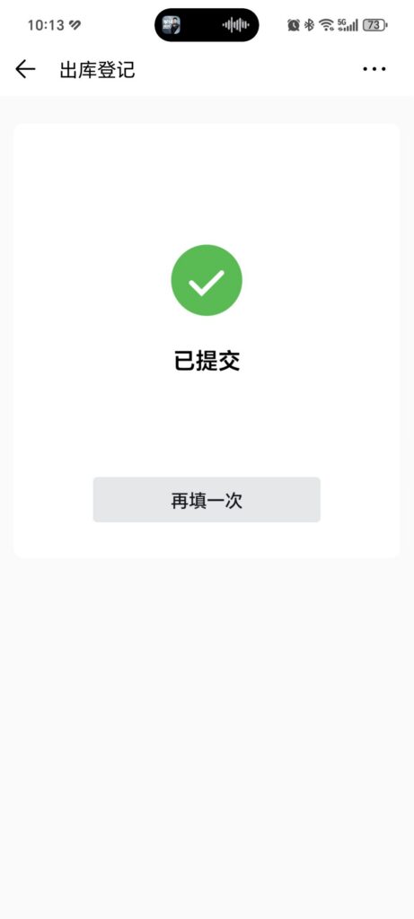 一、确认物品联系实验楼汪湛老师,确认领用物品及数量二、扫码登记注意:只接受“企业微信”扫码三、填写表单填写出库表单四、审核出库填写完毕后,显示提交成功页面即可。 文章导航 智慧门禁系统的人脸录入操作说明初级会计资格证书领取流程